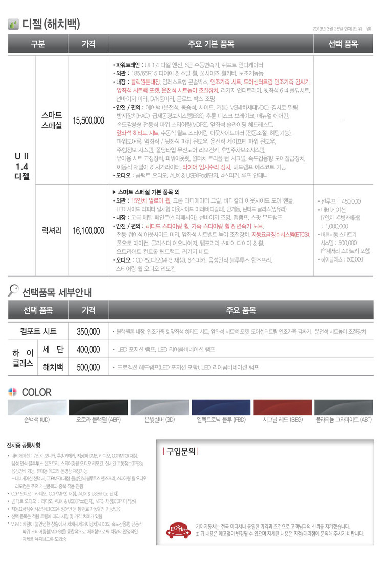2013년 3월 올뉴프라이드(UB) 신차가격표
