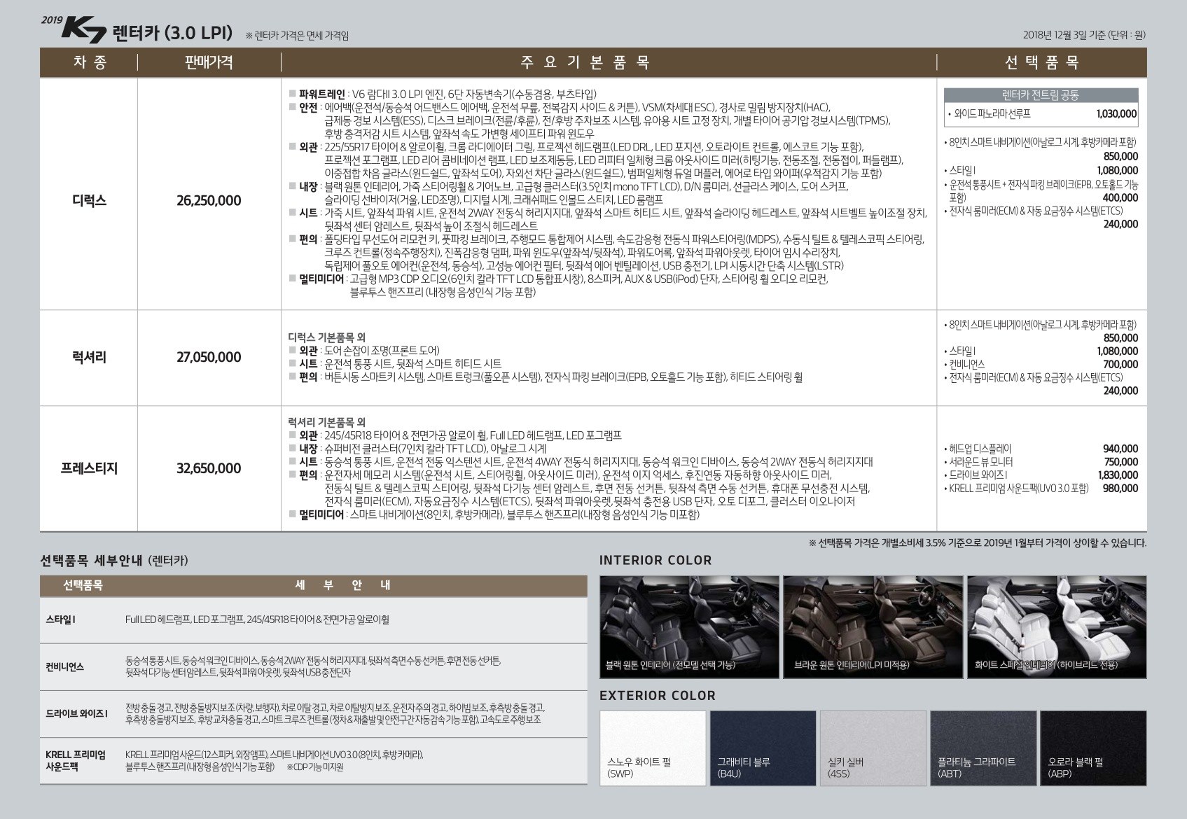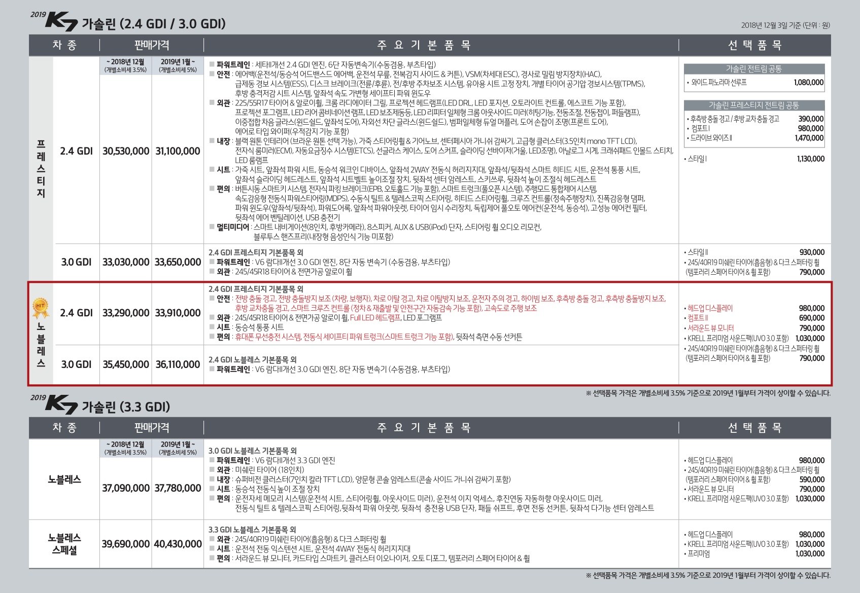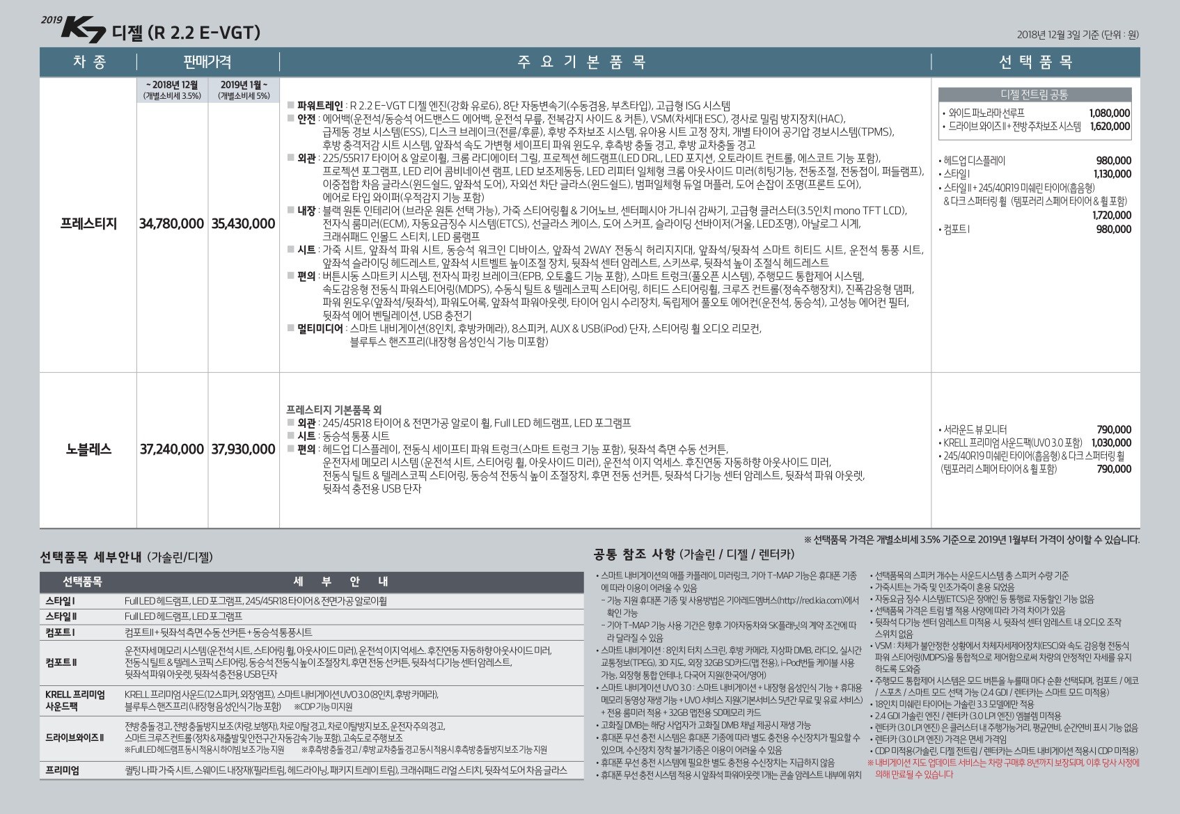 2018년 12월 K7 가격표 (2019년형 K7 출시)