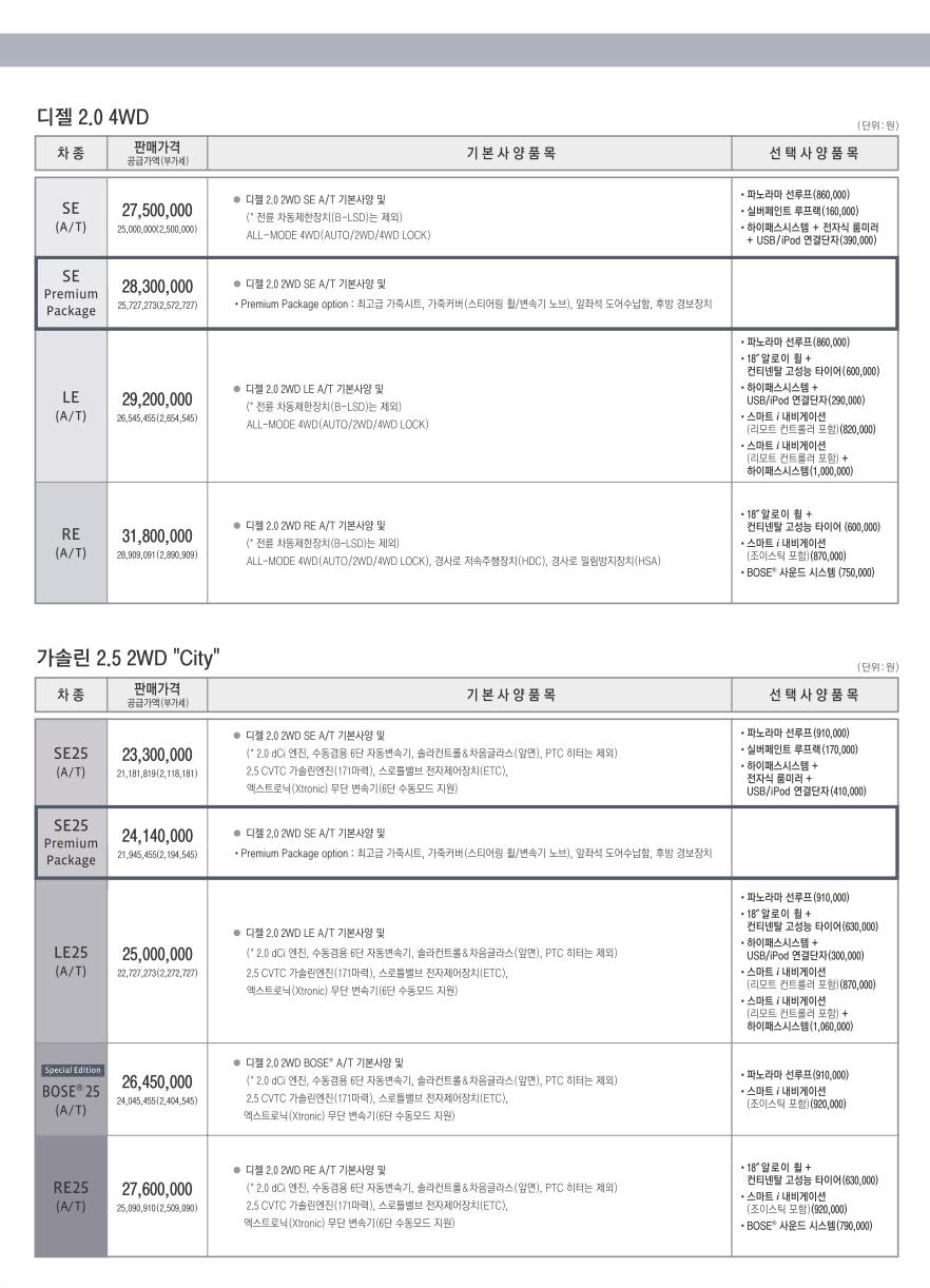 ※ 본 가격표의 모든 저작권은 해당 차량 제조사에 있습니다.