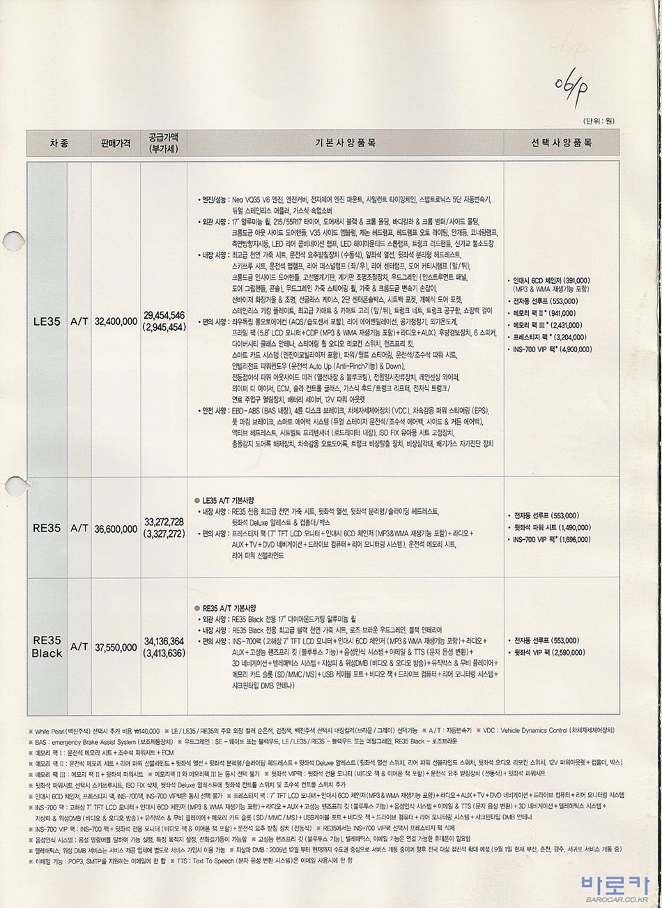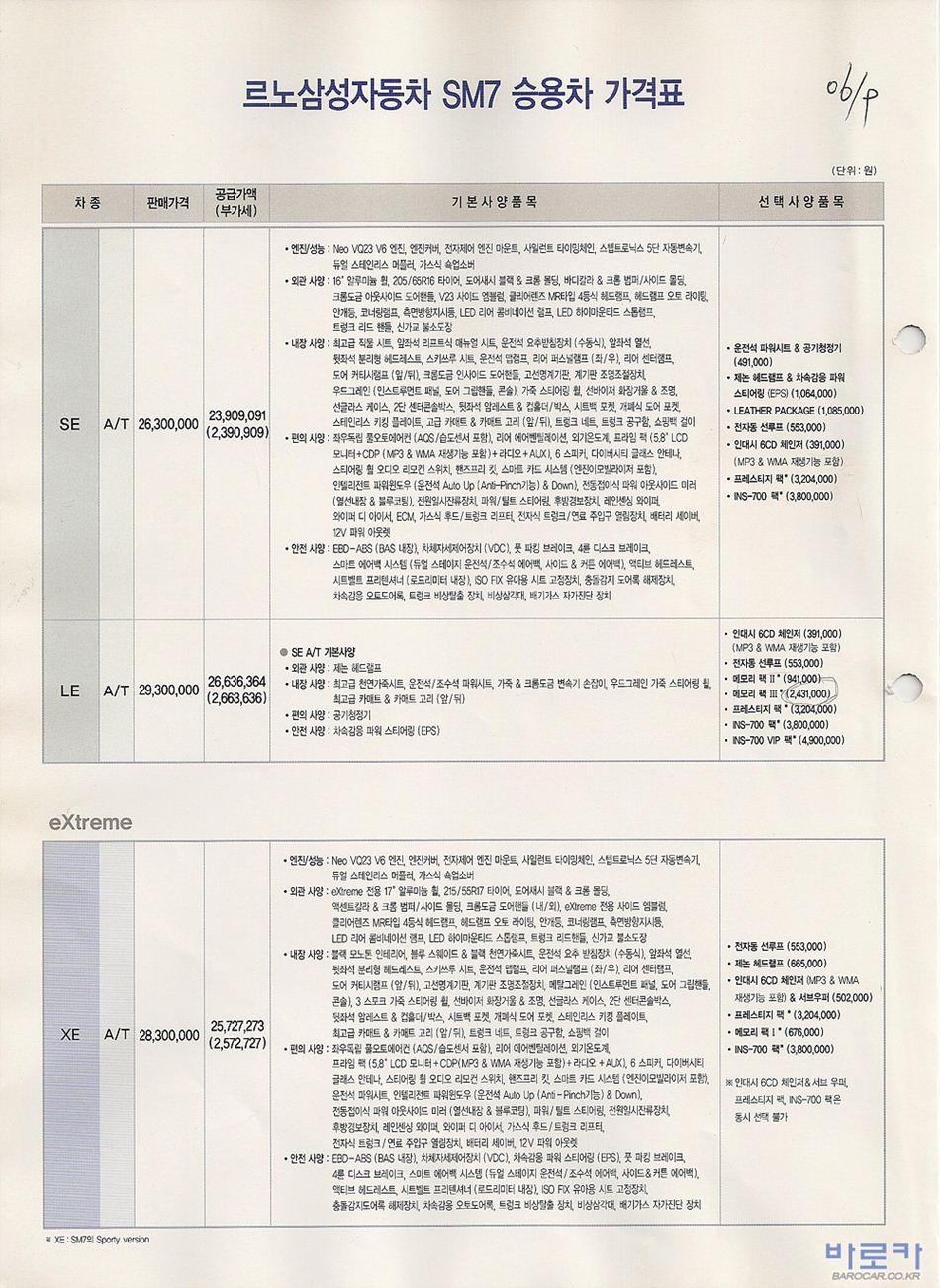 2006년 9월 SM7 신차가격표