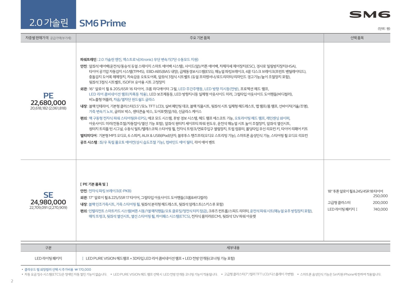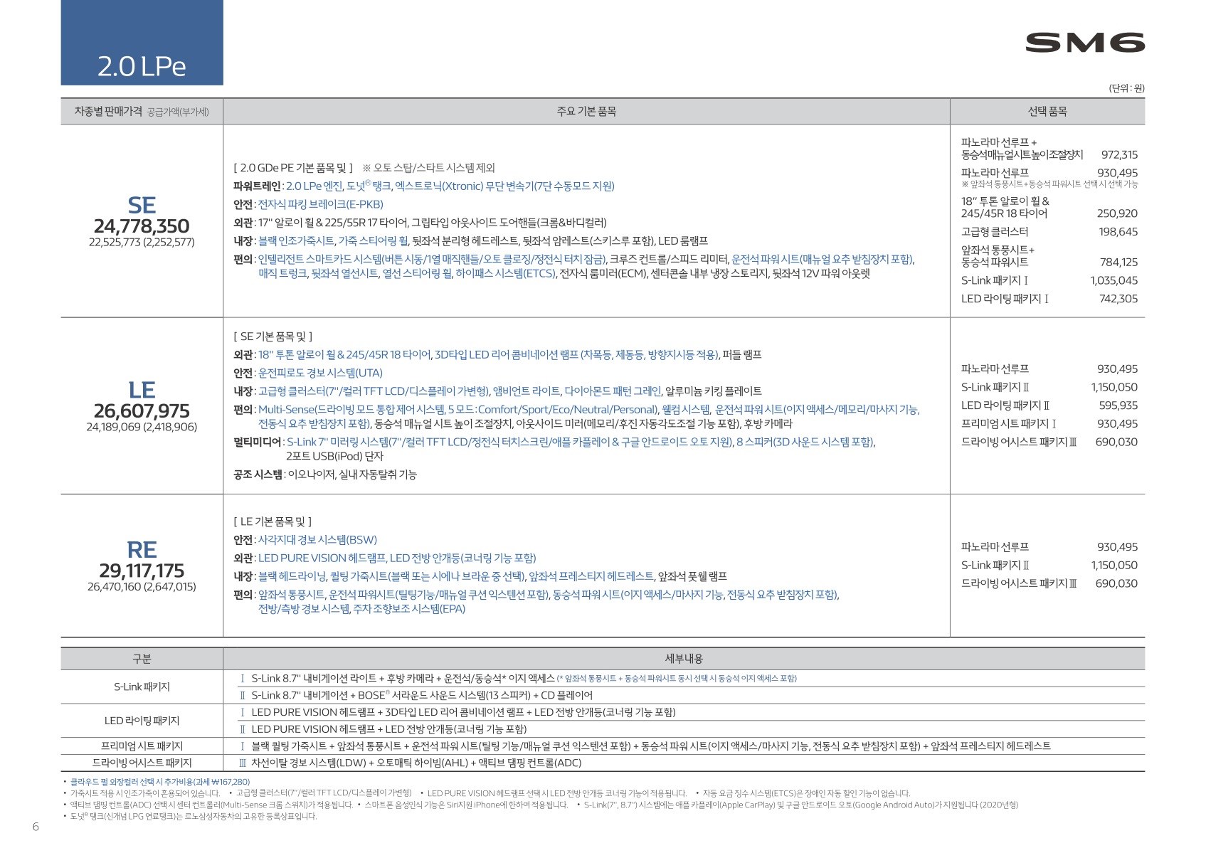 2020년형 SM6 신차 가격표 옵션표 등급표