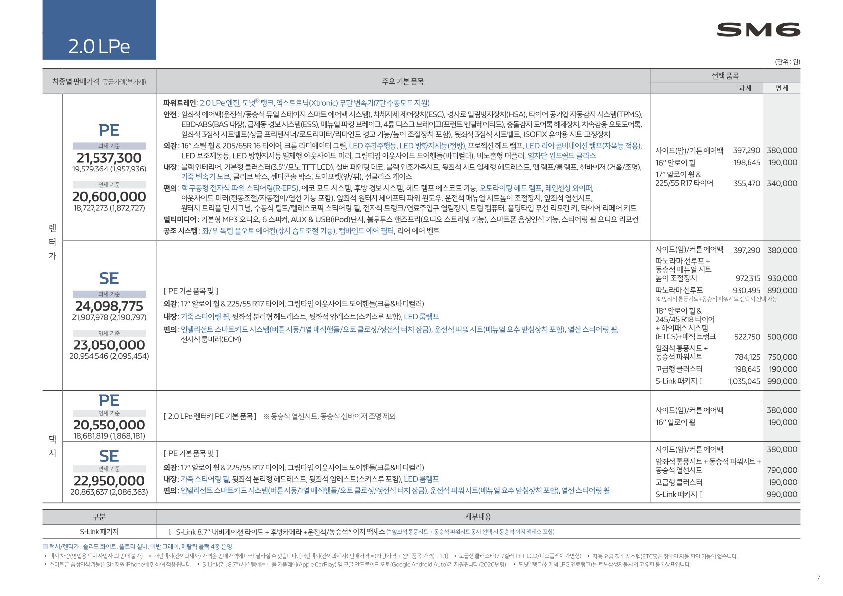 2020년 7월 SM6 신차가격표 (부분변경 모델 출시)