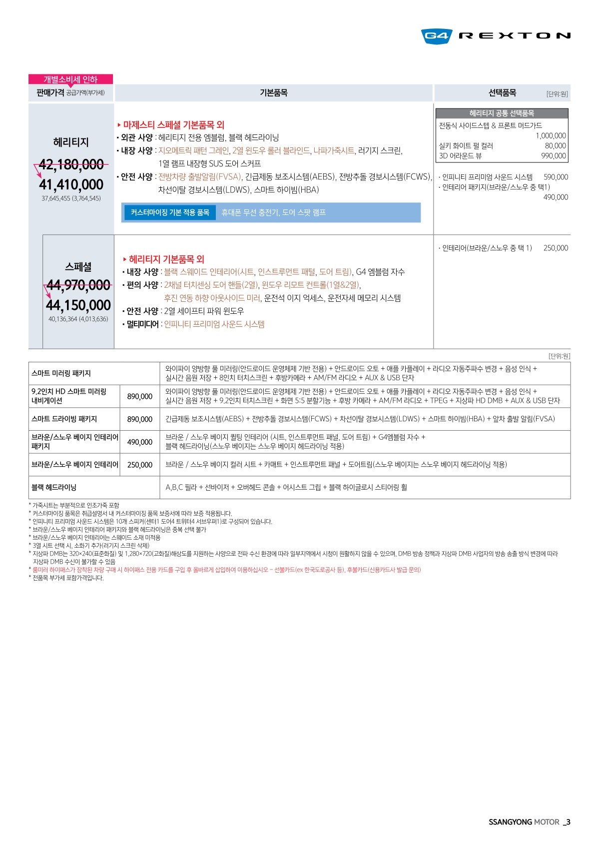 2019년 9월 G4 렉스턴 신차가격표 (2020년형 출시)