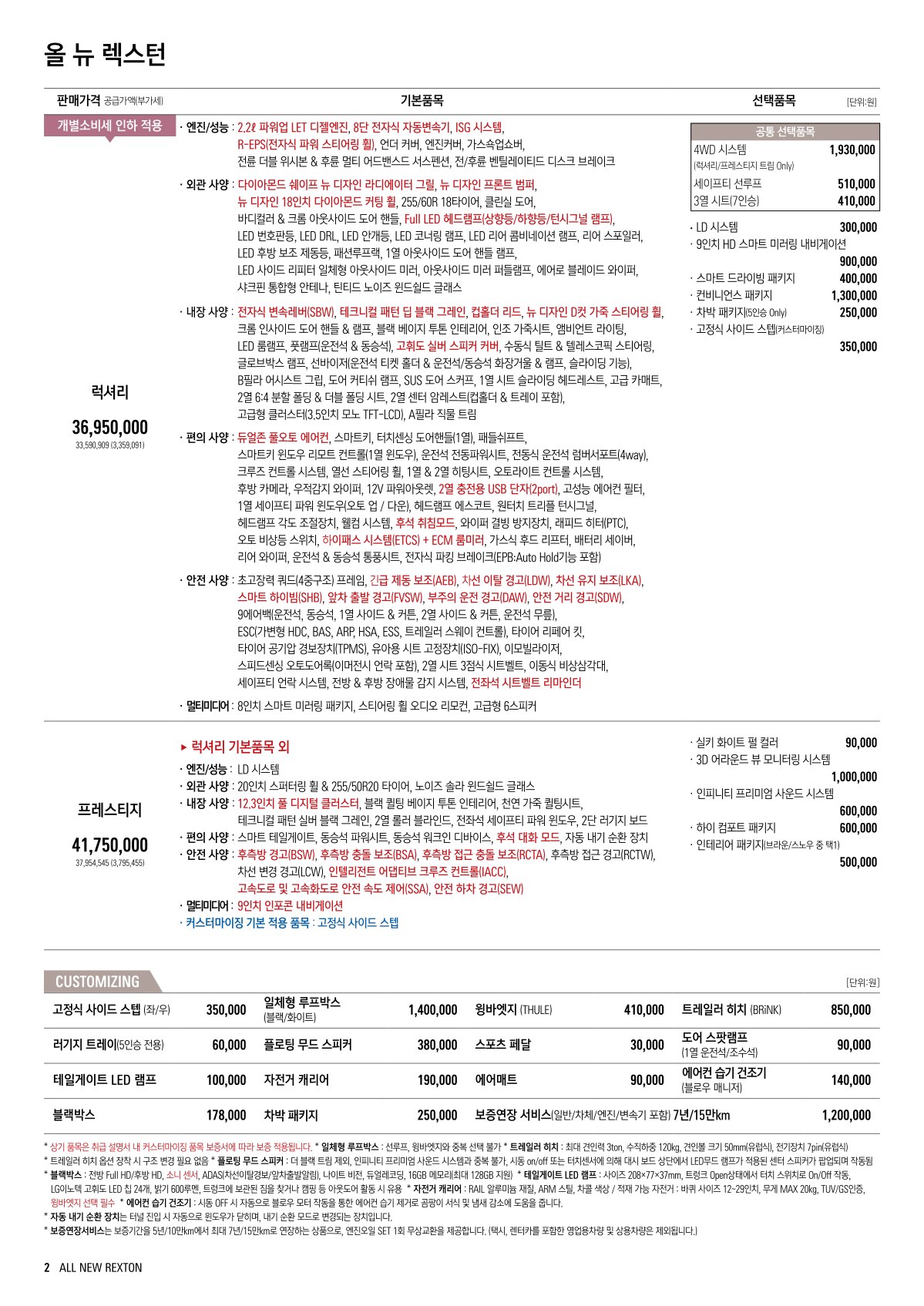 2021년 8월 올뉴렉스턴 신차가격표 (마스터 트림 출시)