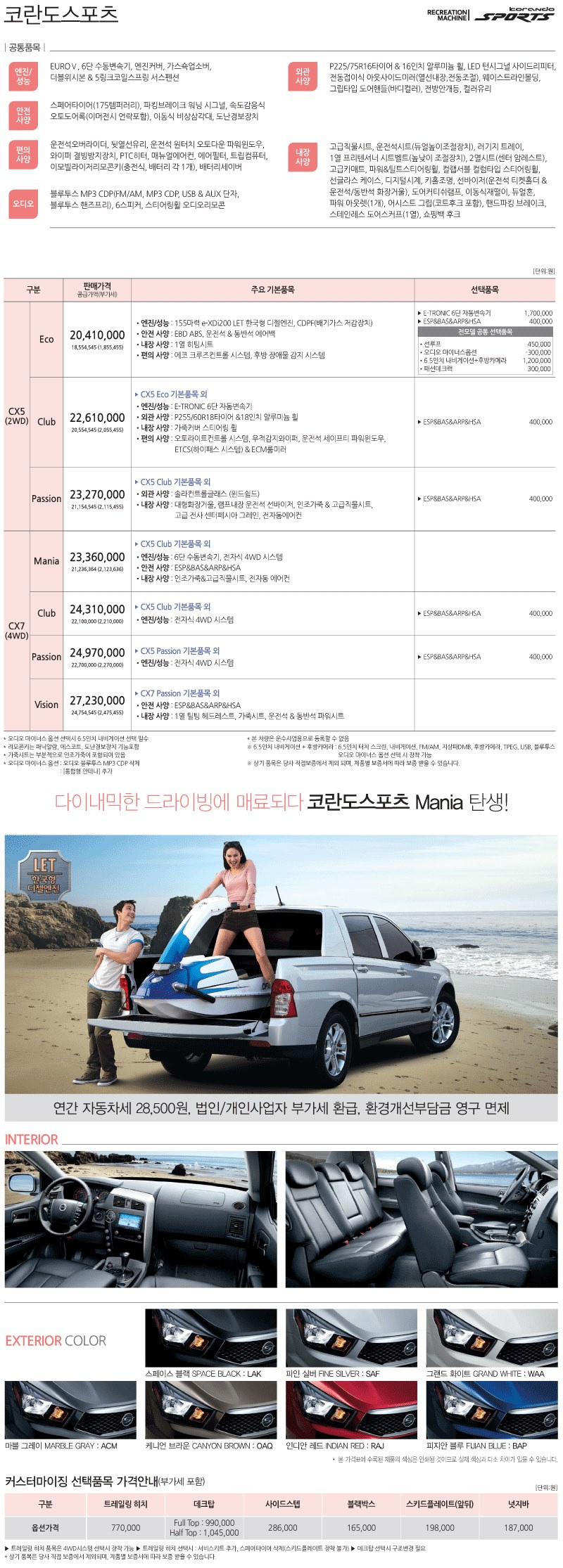 2012년 1월 코란도스포츠 신차가격표